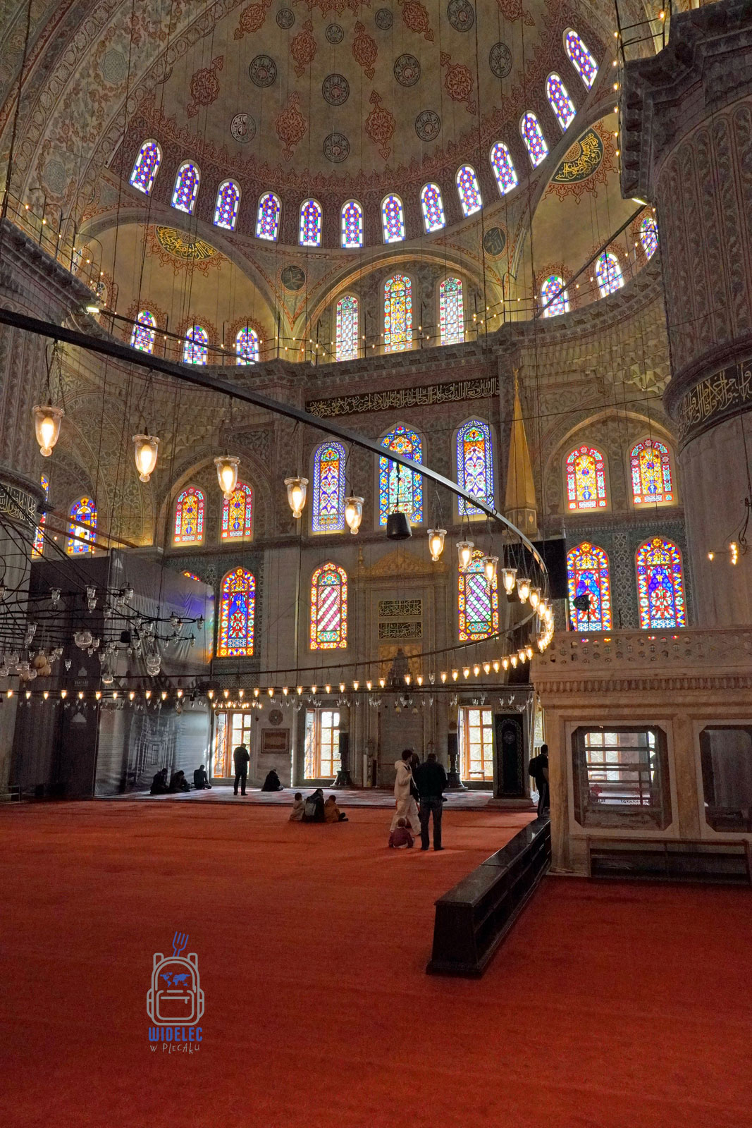 - Wnętrze meczetu zdobi ponad 20 000 ręcznie malowanych ceramicznych płytek w odcieniach niebieskiego i zielonego, które odbijają światło wpadające przez setki okien.